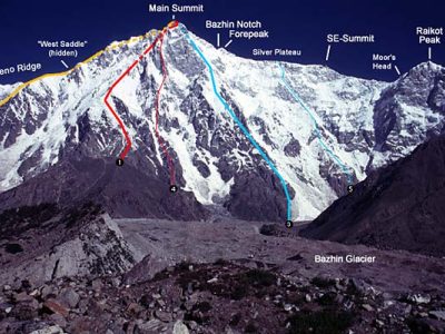 - Buhl Route: Ascends the Rakhiot Face directly to the summit, a technically demanding and dangerous route.